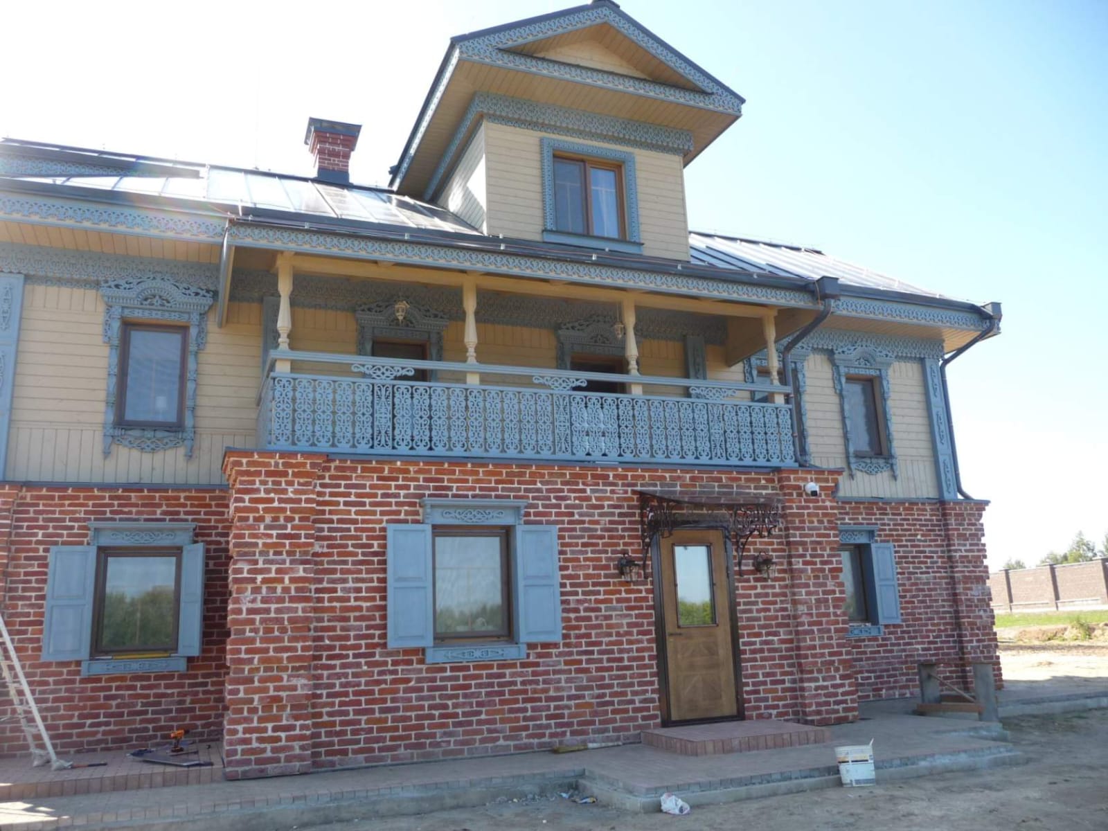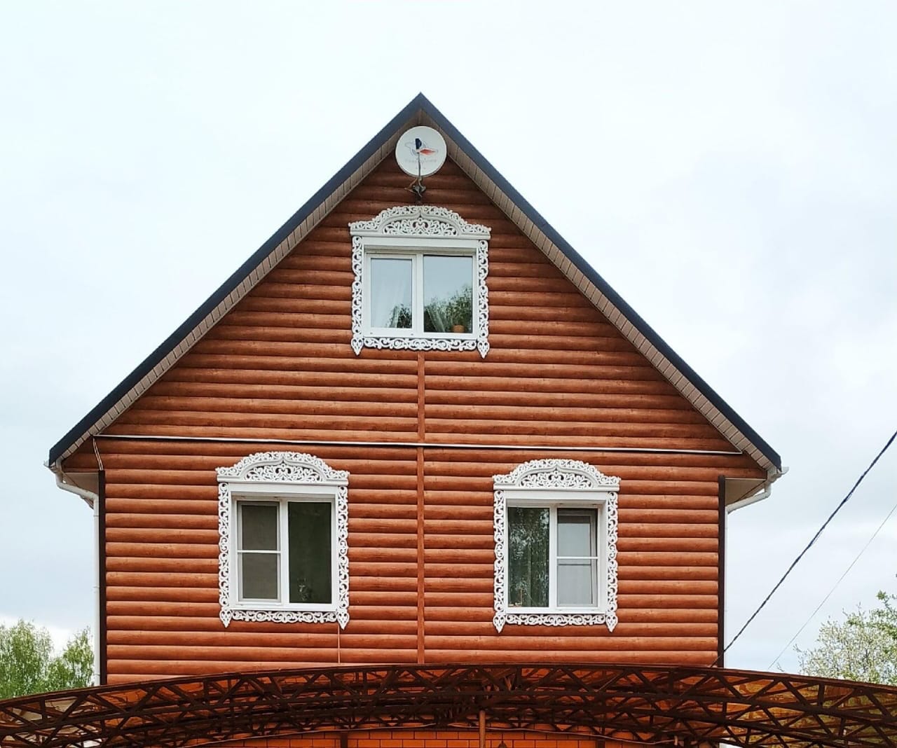 Деревянный наличник прекрасно смотрится на фасаде дома обшитого металлическим сайдингом.