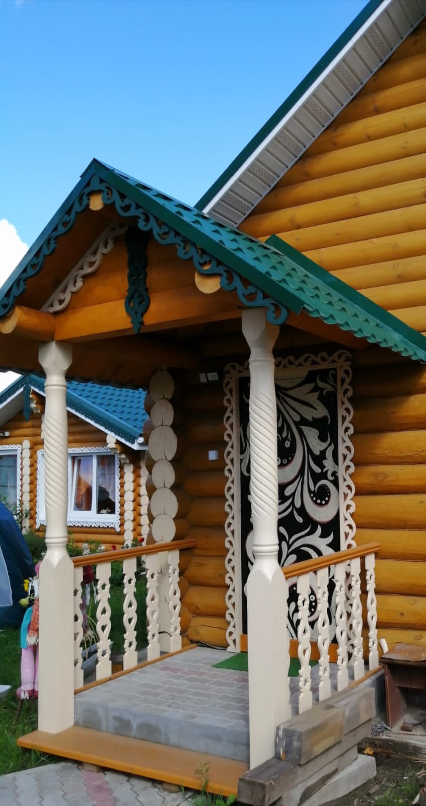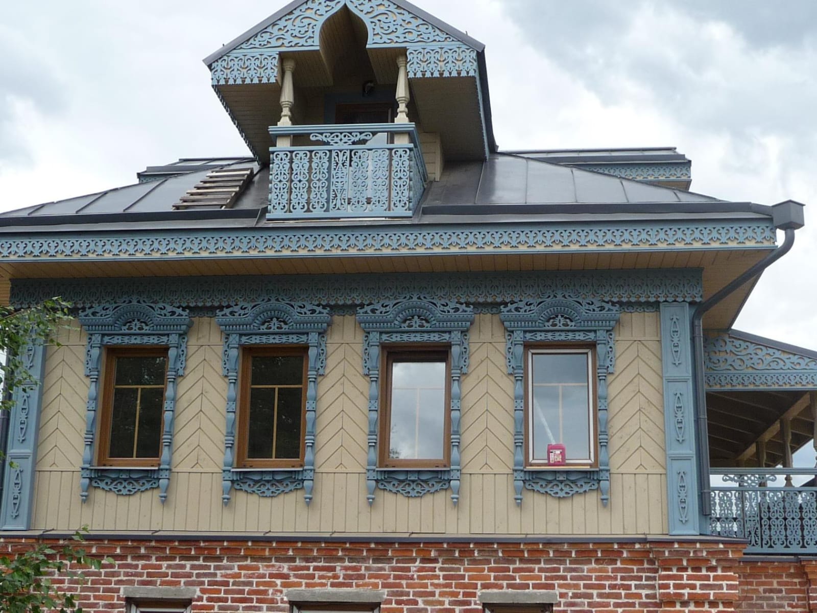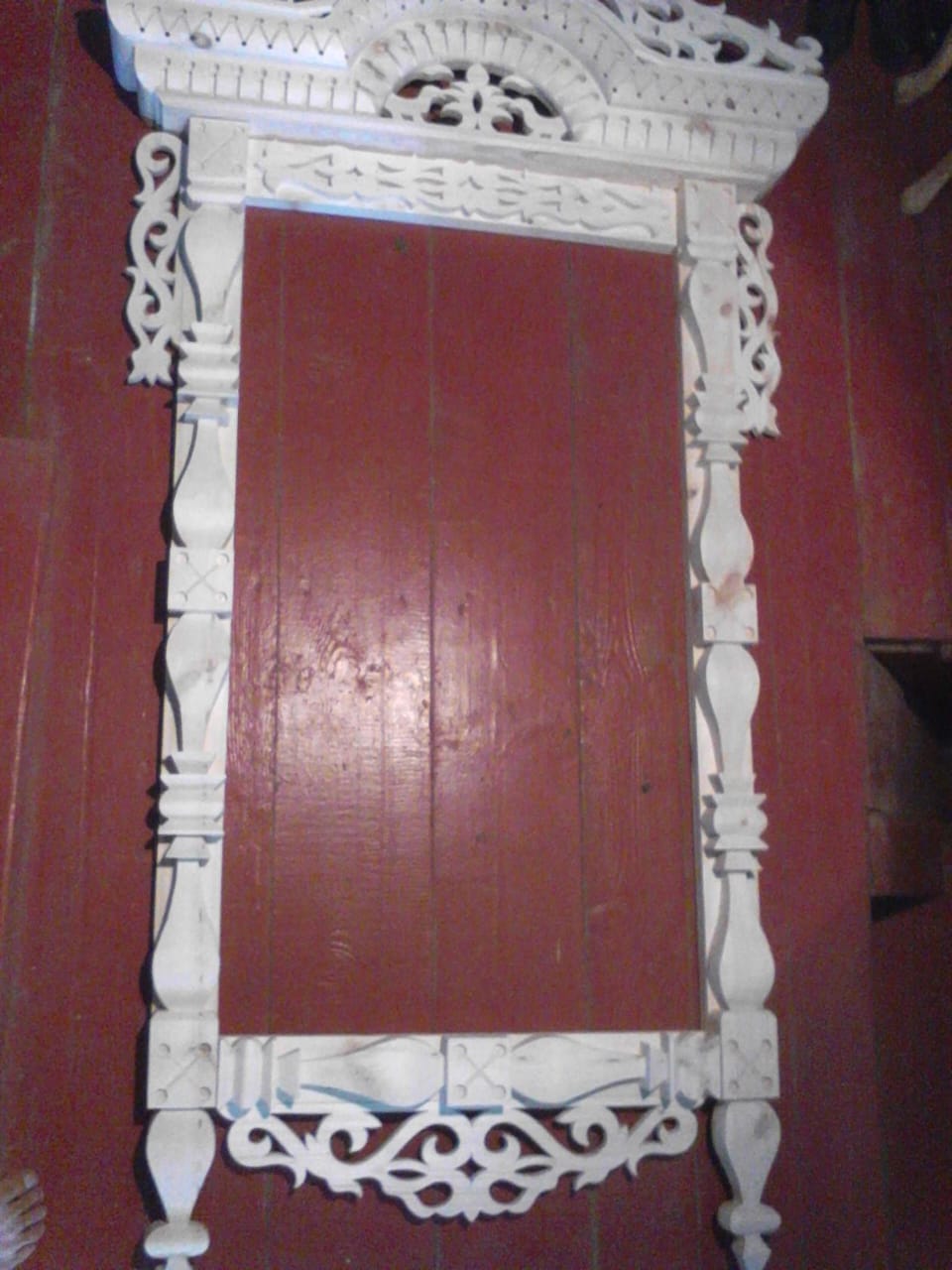 Резные наличники на окнах, служат для защиты окна от осадков и от злого сглаза, который может заглянуть в окно,ну и для украшения фасада дома. Резьба выполнена в стиле костромского и ярославского древнего зодчества. Наличник собран из нескольких отдельных элементов, покрыт краской.