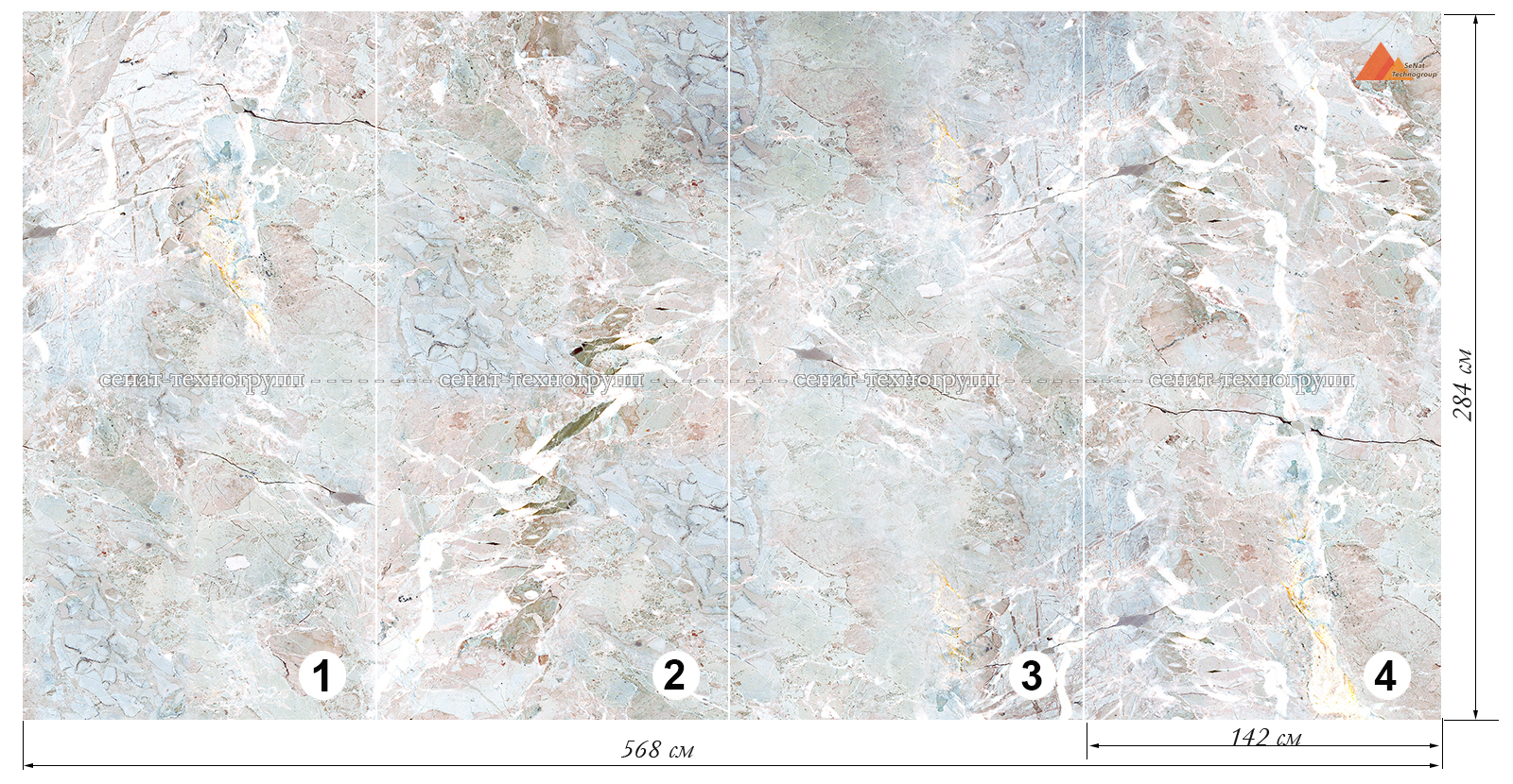 Рисунок данной серии мрамора состоит из четырех листов. Они клеятся в определенном порядке и образуют на поверхности закономерный рисунок. 1-й и 4-й листы также стыкуются между собой.