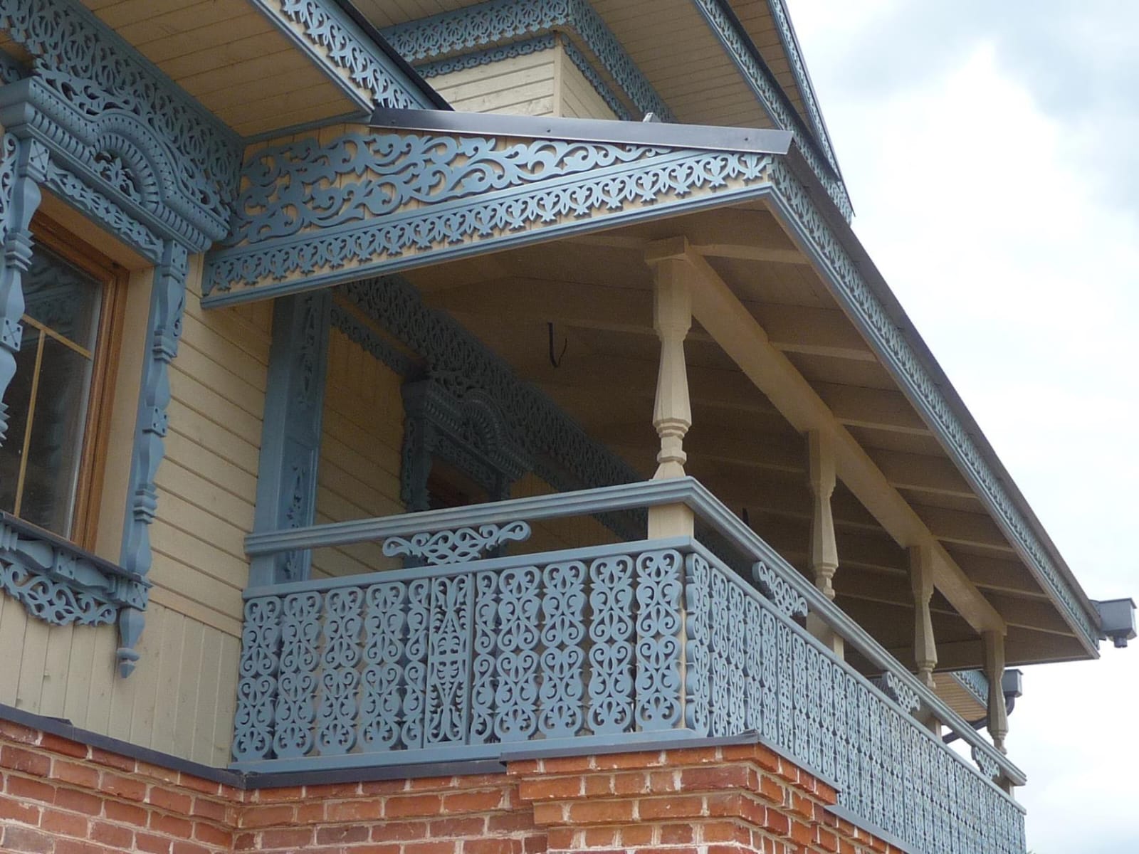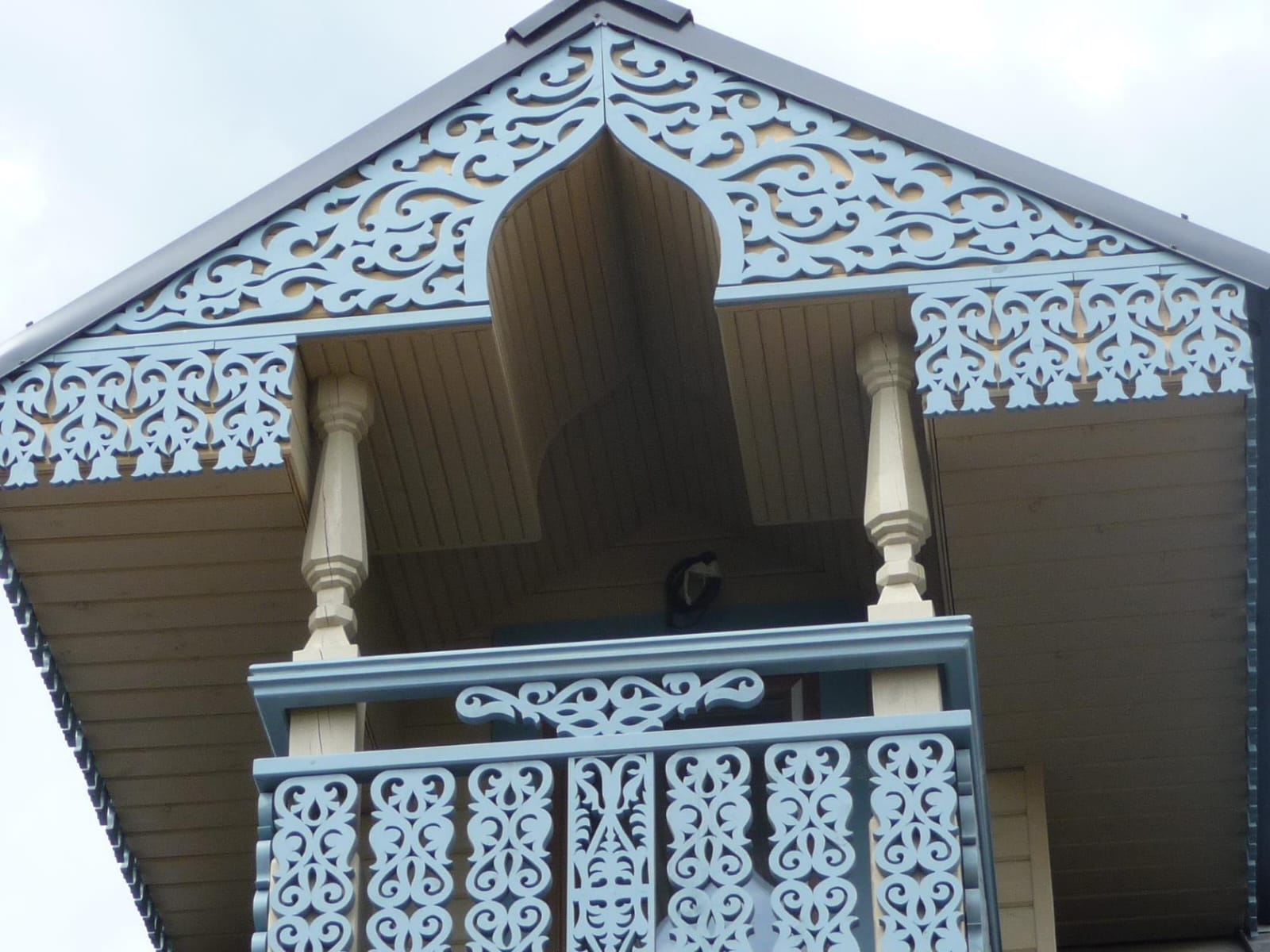 Ограждение балкона, выполнено из дерева, сосна, ель. А так же домовая резьба. Свесы в виде колокольчиков.